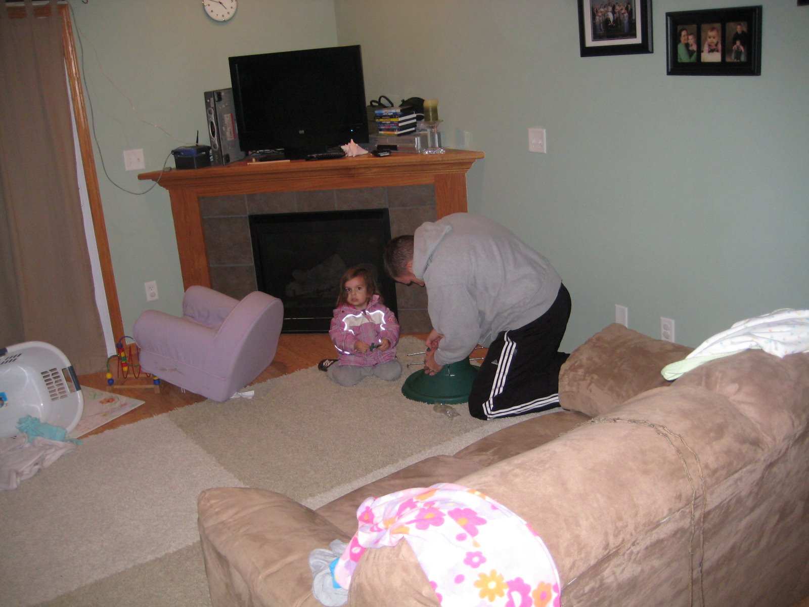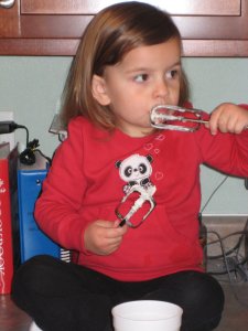Leila and I made presents for her daycare teachers. Leila’s job was to fill the pillows with the rice/beans/lavender mixture. While she was loading up her spoon Cory took a picture and told her to look at Daddy. You can see she had a hard time multitasking πŸ™‚