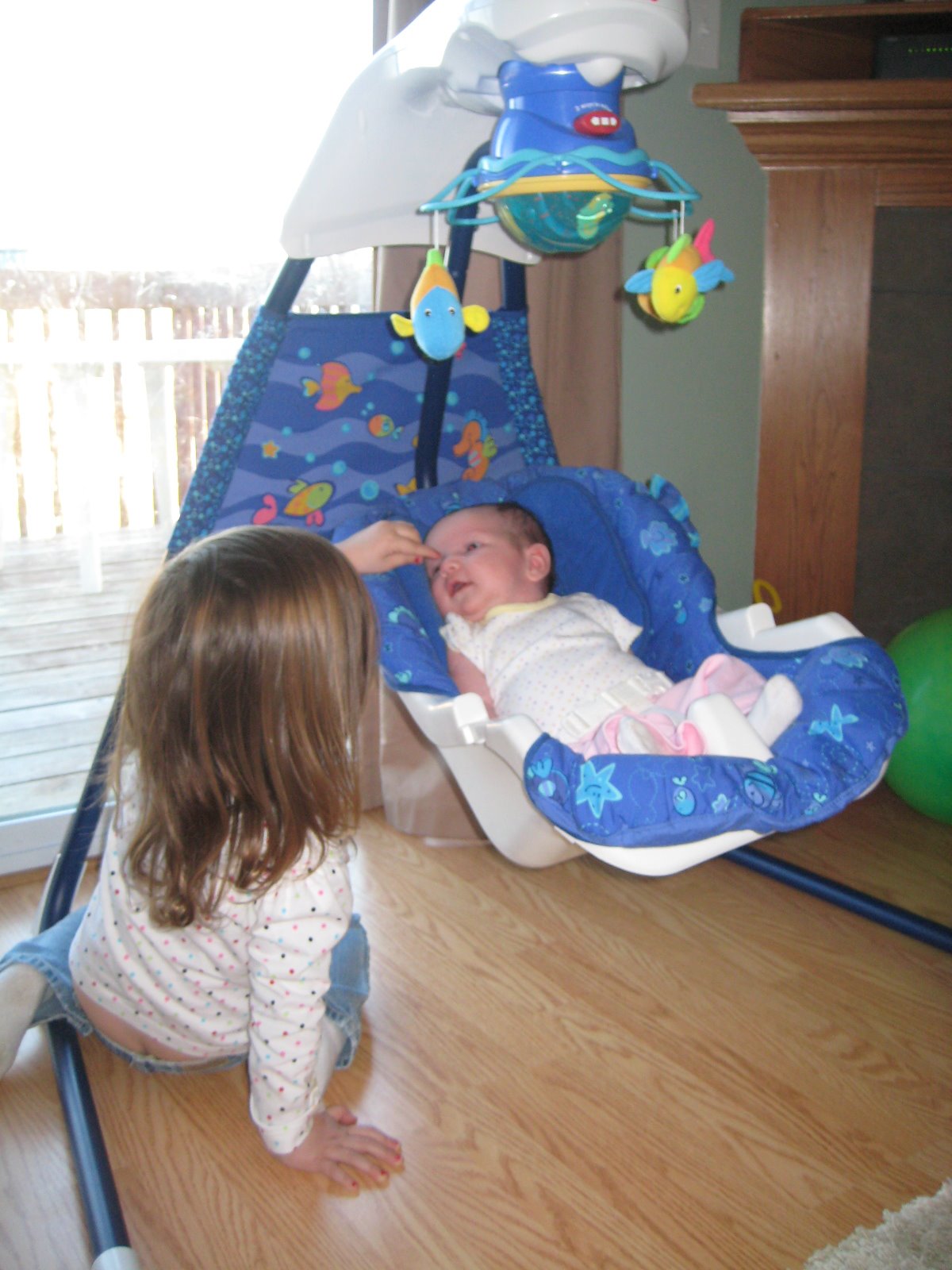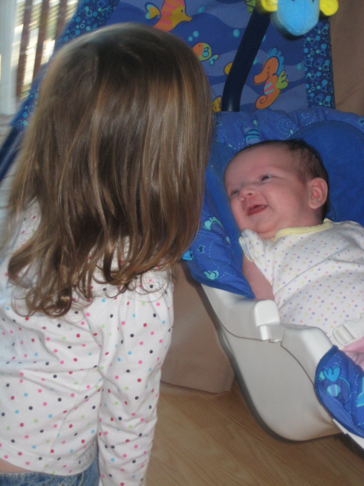 So I know that babies usually start smiling around 6-8 weeks, but I promise you that I am not making it up that Thea started smiling around 3 weeks old. I was convinced they were real when she would smile when I stuck a mirror in front of her face. Tonight big sister Leila was singing to Thea and I caught my proof on camera! In these pictures Leila was singing to Thea and Thea was smiling and watching her big sister…it was a really neat moment.