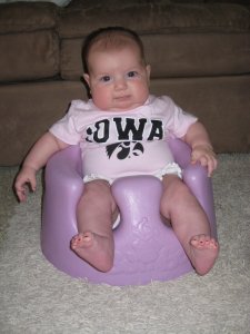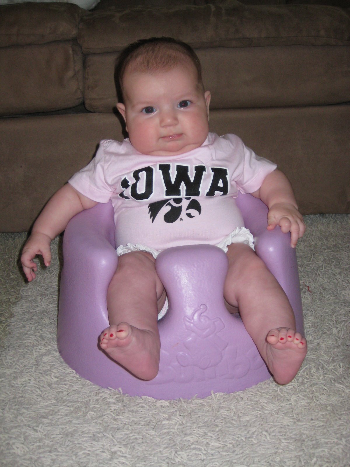 >Our littlest hawkeye trying out the bumbo seat. Her legs are a bit on the chunky side and the bumbo was kind of a tight fit! 🙂 And yes, her toe nails are painted.