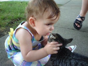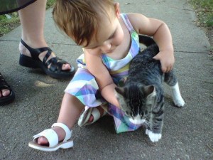 I found this picture on my phone memory card when looking for vacation pictures. It was taken in July of 2007, during my Uncle Jim’s funeral Cory took Leila outside to walk around and she found these very friendly kittens.