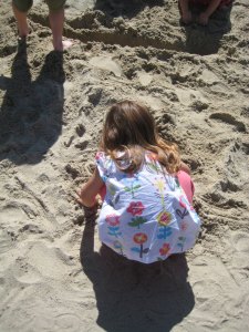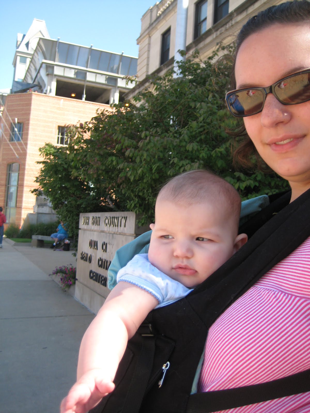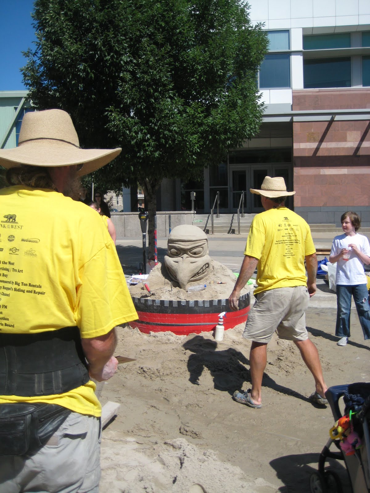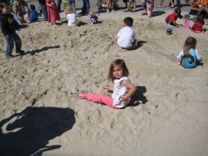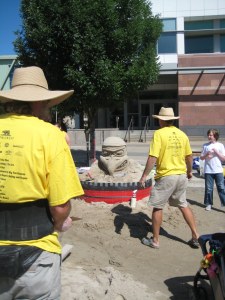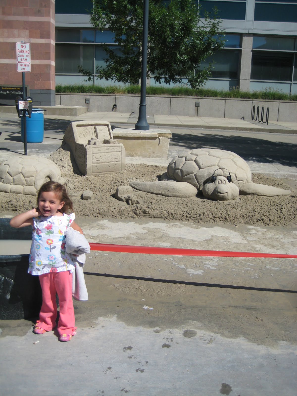 >This morning Cory wasn’t feeling well, and I decided to brave taking the girls downtown by myself to get us out of the house. I titled this post building memories because on days like today when the task of two little kids all by myself at a crowded outdoor event seems too overwhelming, I have to remind myself that I am building memories for Leila and I want her to remember doing fun and unusual things, not watching cartoons (which she already does too much of!) This event is called Sand in the City, and it was really cool! Lots of giant sand sculptures to see, and we got to watch them working on carving out a herky! Aside from the sculptures they also had a couple of giant sand piles for the kids to plan in and some other games and balloons. So out we went! Just mom, Leila, Thea one umbrella stroller and my Ergo baby carrier. The Ergo is nothing short of a lifesaver, I don’t think Leila would get to do nearly as many fun things if I didn’t have the option of wearing Thea in a baby carrier. Thea even seems to really like it, so much that has been known to take a snooze or two in her cozy carrier!