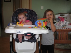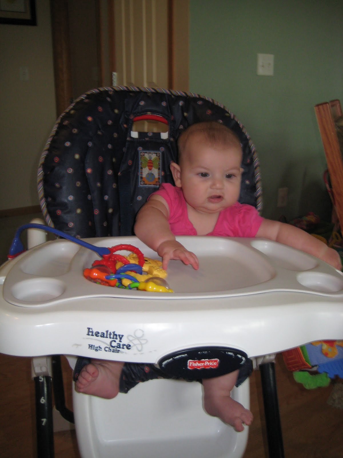 Thea isn’t eating food yet, but we are planning to start her on it when she turns 6 months. In the meantime she has been trying out the high chair. She likes to sit with us at dinner time and practice on her toys!