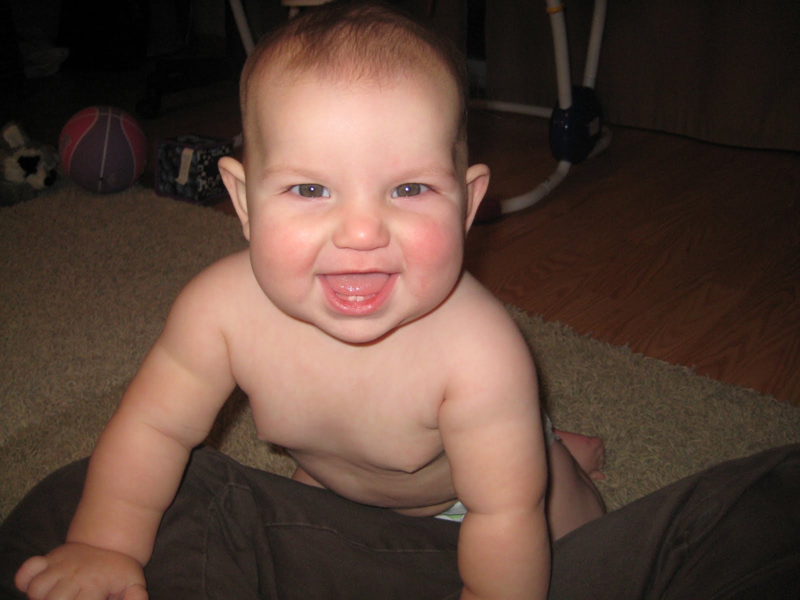 >She is crawling for real now, on hands and knees, and she recently was able to pull herself up to stand at the couch. She will be cruising in no time, but so far she just pulls herself up and looks at you with this look of glee and accomplishment.