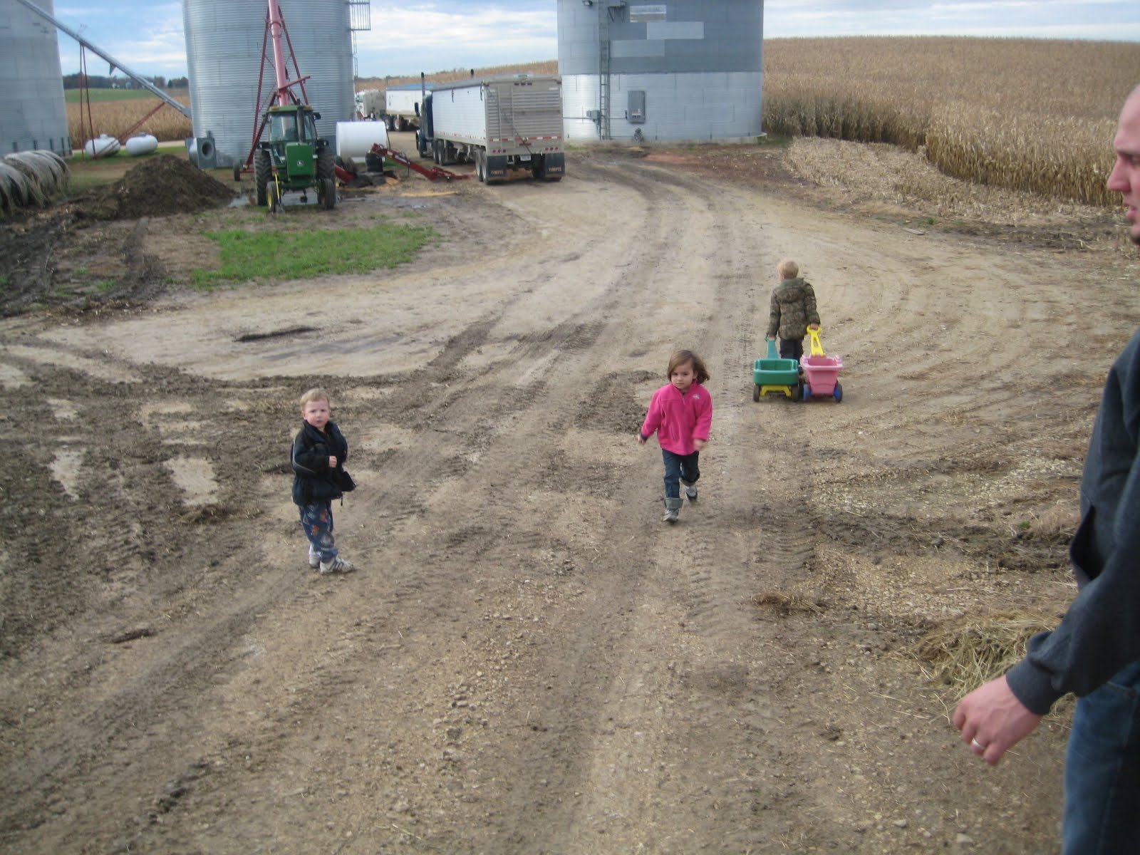 We had lunch, steaks on the grill. Of course they didn’t come from Hy Vee, but were home grown and delicious! The weather was perfect even though the grown was kind of wet so we took the kids out to play. Bryce will be 4 in just a couple of weeks and he is such a proud farm boy! He LOVED showing us around. The kids started off by picking up fallen apples out of the back yard and filling their wagons so we could feed them to the cows. It was at this point that we realized that we had left our camera inside and that such cuteness was going on with Bryce, Eli (just turned 2) and Leila, that we would have to run in for it. Let me take you on the photo tour, led by Bryce: