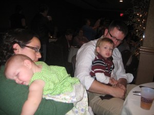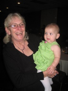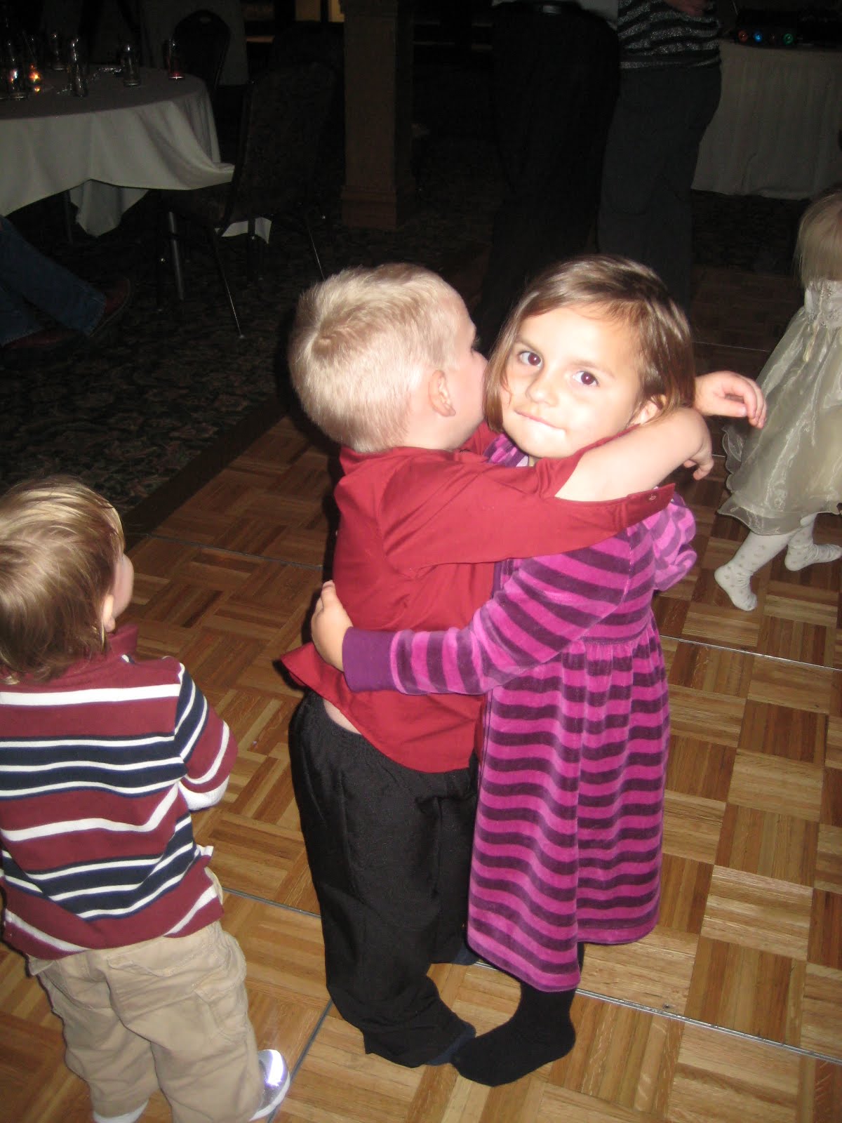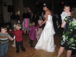 >Last weekend we all traveled to Lincoln, NE for my cousin Brandon’s wedding reception. The kids were very excited to have a party to go to, and they had a great time. Leila was totally enthralled by Polly in her wedding dress. She has this wonderful enchanted look in her eyes when you talk about weddings. She loves to get to go to princess parties, and nothing says princess like a wedding dress! I recently pulled my dress out of the closet and tried it on for her, she was very excited! Thea got to meet her Grandma Lorna for the first time!
