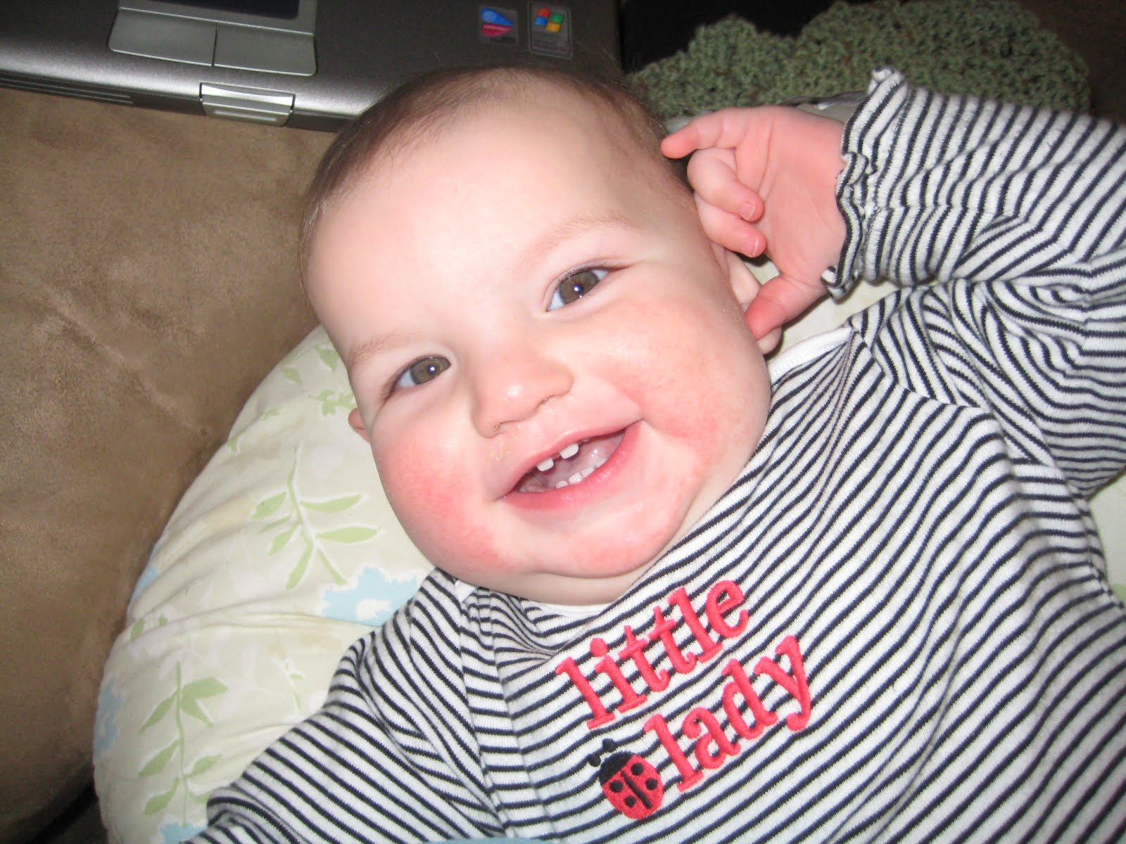 >For some time I have speculated, but I now feel confident in saying that along with “Dog” Thea also says “all done.” After she nurses she will pull herself away from me and she says, “ah-da.” Since we use the sign for “all done” and ask her if she is finished at the dinner table, this makes sense to me, oh, and its cute.