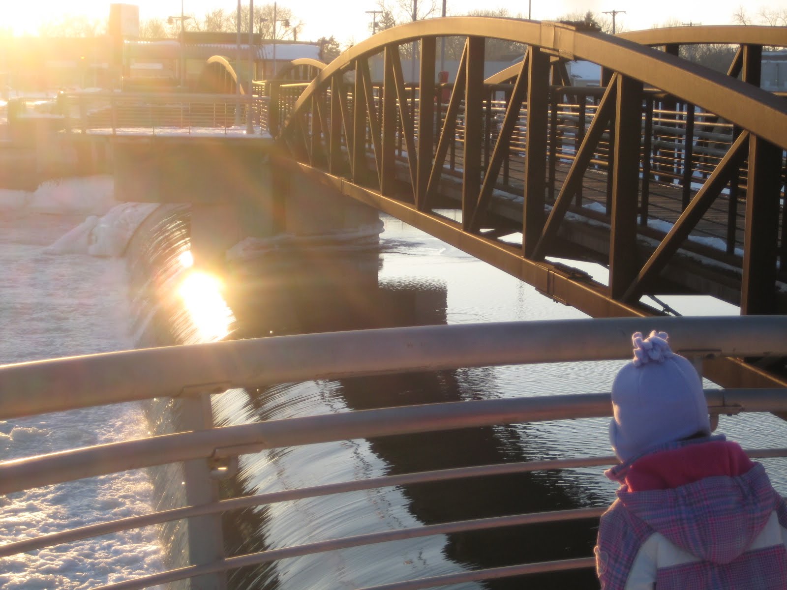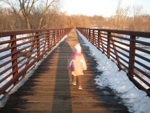 >Anyone in Iowa City can tell you that if you want to see some huge bald eagles, go hang out by the river during the winter time.  We decided that today’s 35 degree weather warranted a trip out to see what we could see. I guess we picked a bad spot to stalk the eagles though, because the only ones we saw were so far away that Leila didn’t really get much of a look at them.