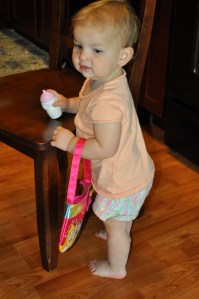 This is another picture of Thea that shows her little personality. She has started to carry around this purse and stick treasures in it. I just love seeing how much she is picking up from other people. She is doing lots of sign language these days, including “all done,” “more,” “drink,” “milk,” and “bath.” I can’t get enough of my little princesses and they both seem to really like each other and seek each other out to play together during our days together. Life is good!