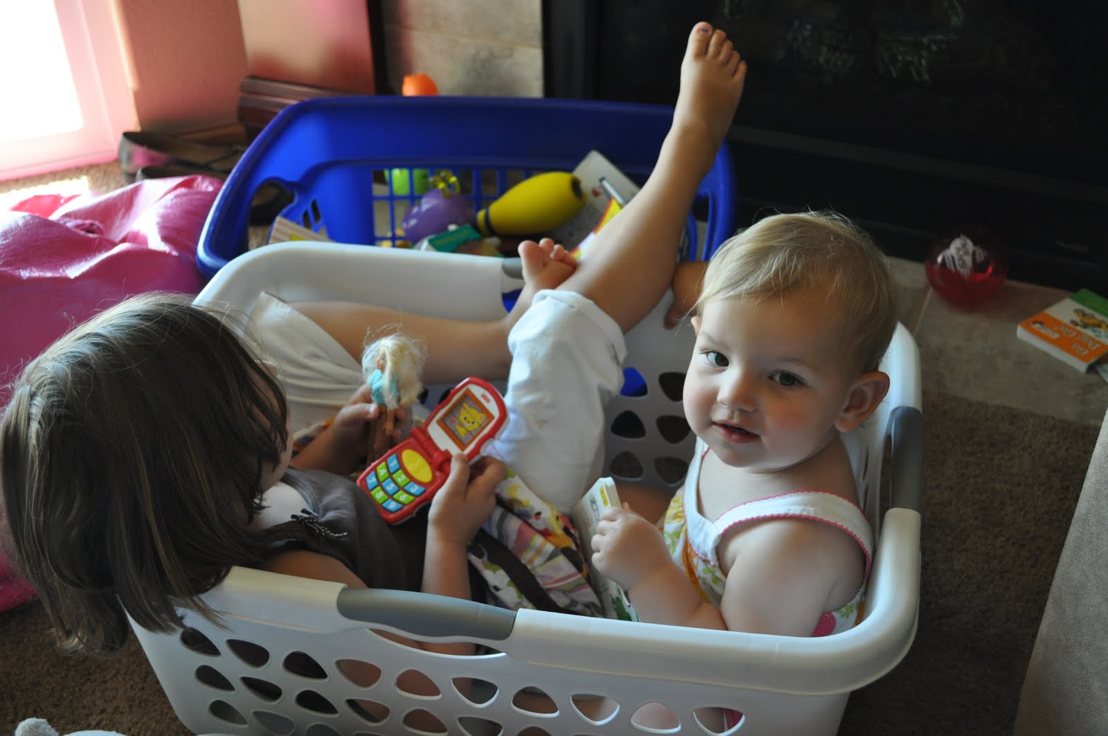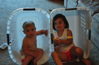 >The older they get, the better the playing gets. Even though Leila is so often guilty of making her sister cry, that this evening when Thea fell and hit her face on the floor, a whole room away from Leila, Leila yelled out, “I didn’t mean for her to fall!” Thea loves her big sister, and is always quick to follow her lead, and Leila is happy to oblige!