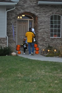 Leila started out the night with no interest in going up to a strangers door and asking for candy. My Dad and I followed behind while Cory and Andrea led the kids up to the first driveway. I assured Leila that she had met the people who lived in this house, and there was no reason to be scared. I guess the allure of candy, and the reassurance that she would not be confronted with a total stranger was enough to give her the boost she needed to head up to the front door. She returned to the sidewalk with renewed confidence, and we were off!