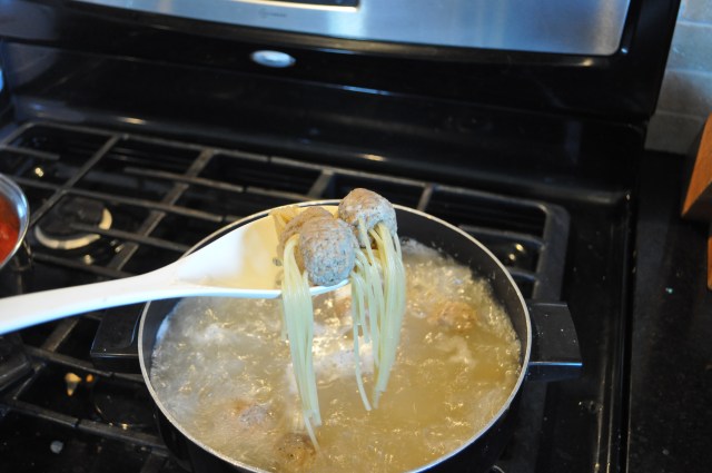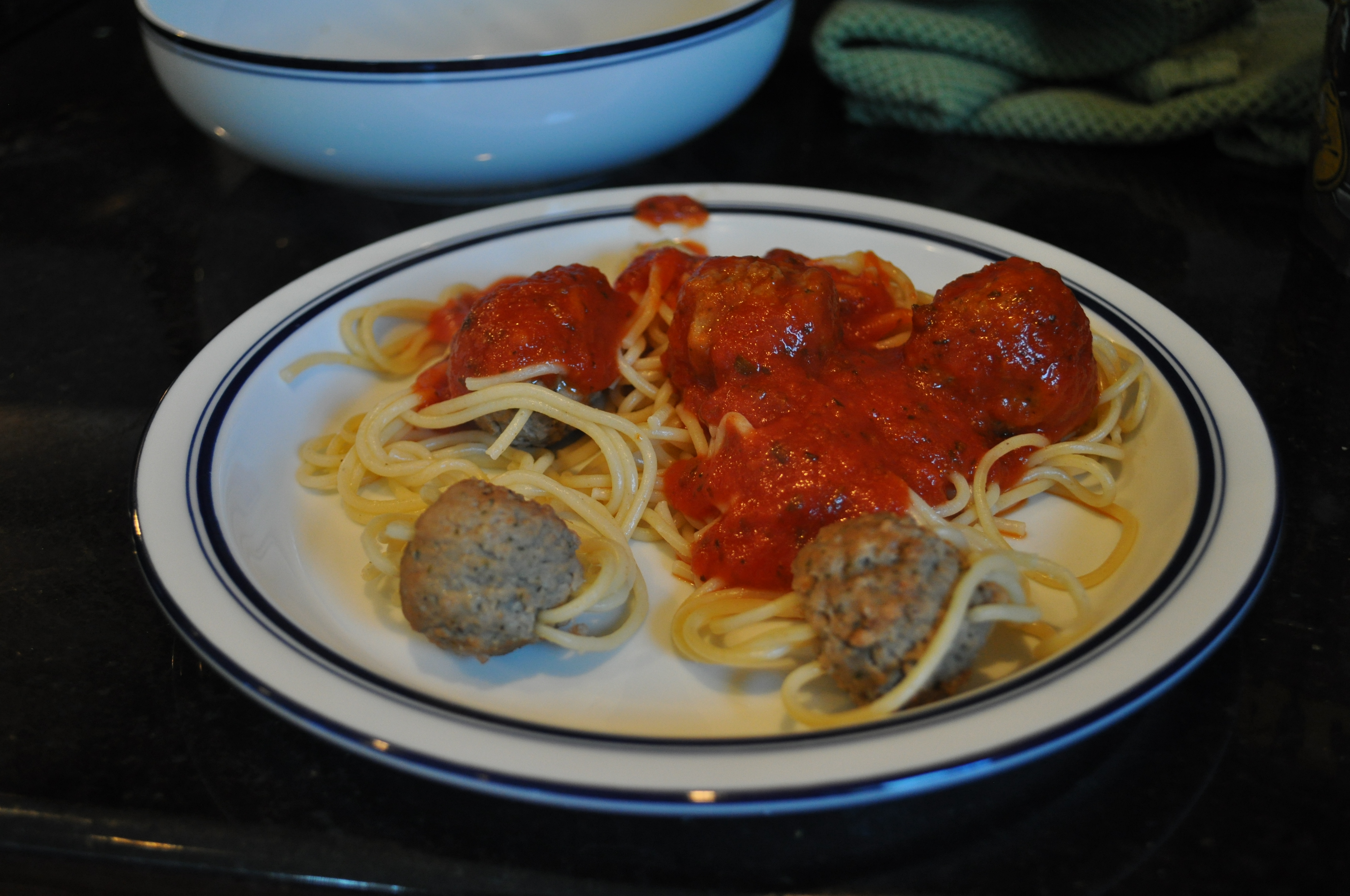 My pilates instructor told us about a fun food item she was making for dinner one night (hot dogs with spaghetti noodles cooked into them) and I decided to take it a step further in the hopes that my children would eat spaghetti. I used store bought meat balls, and it was really easy to create the spaghetti monster effect. I would call the over all experience a partial success. Leila ate some, but still would not allow any sauce to touch her plate. Thea didn’t really eat it. I guess she isn’t quite old enough for the gimmick to work on her.