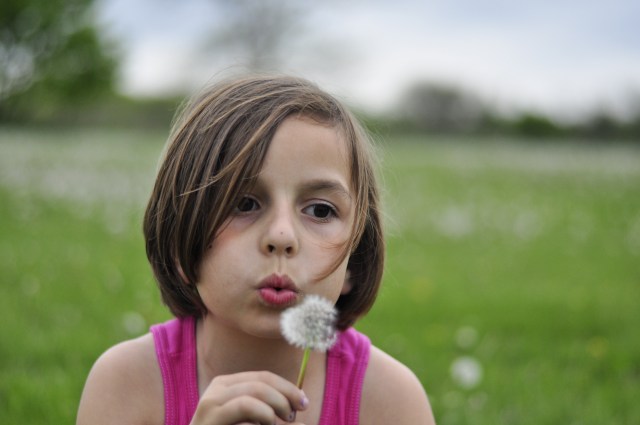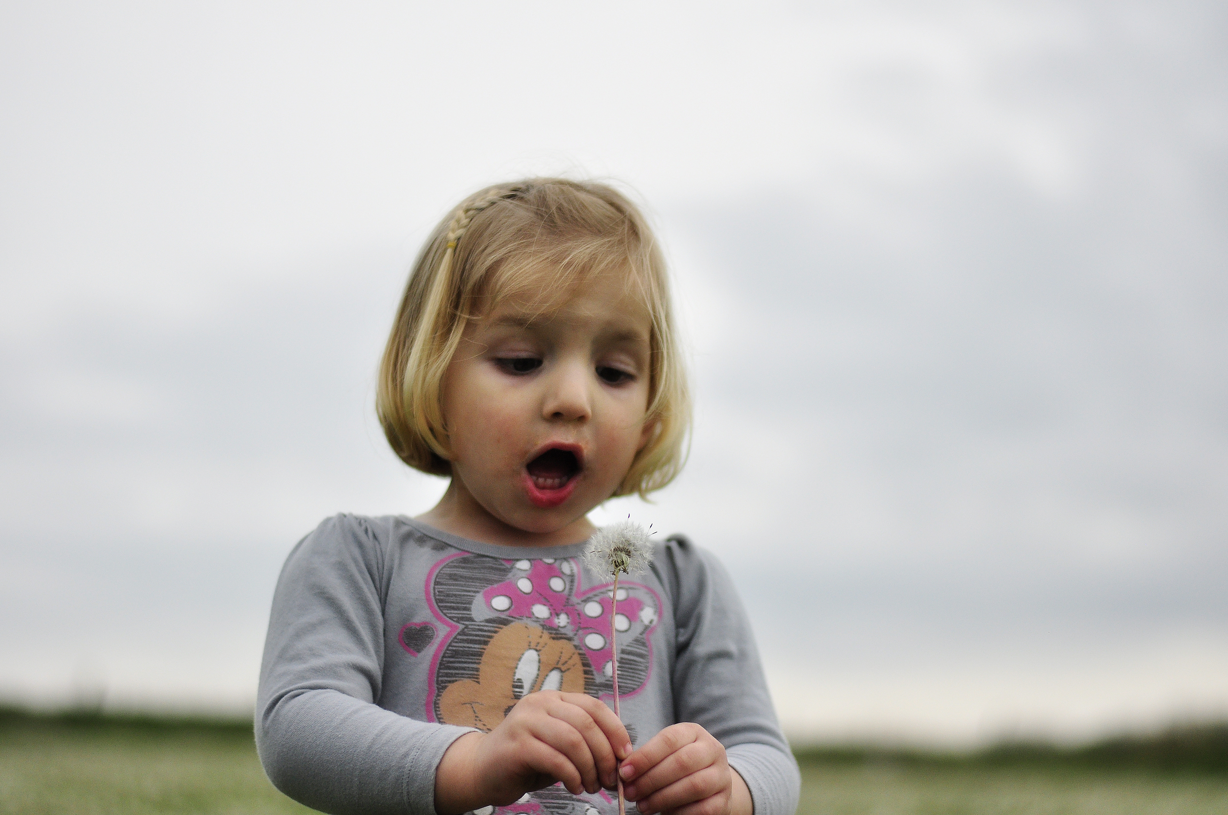 A friend posted this on Facebook today, and it struck me, as I am sure it strikes a lot of other women. Just this weekend I was walking around outside with my girls after chatting with some neighbors. I noticed that the grassy field at the end of our street was covered with dandelions that had gone to seed and I remembered seeing lots of cute shots online of kids spreading dandelion seeds. I ran inside and grabbed my camera and the girls and I headed off to the grass. We all sat down and I starting taking pictures of my little ladies while I toyed with my settings.